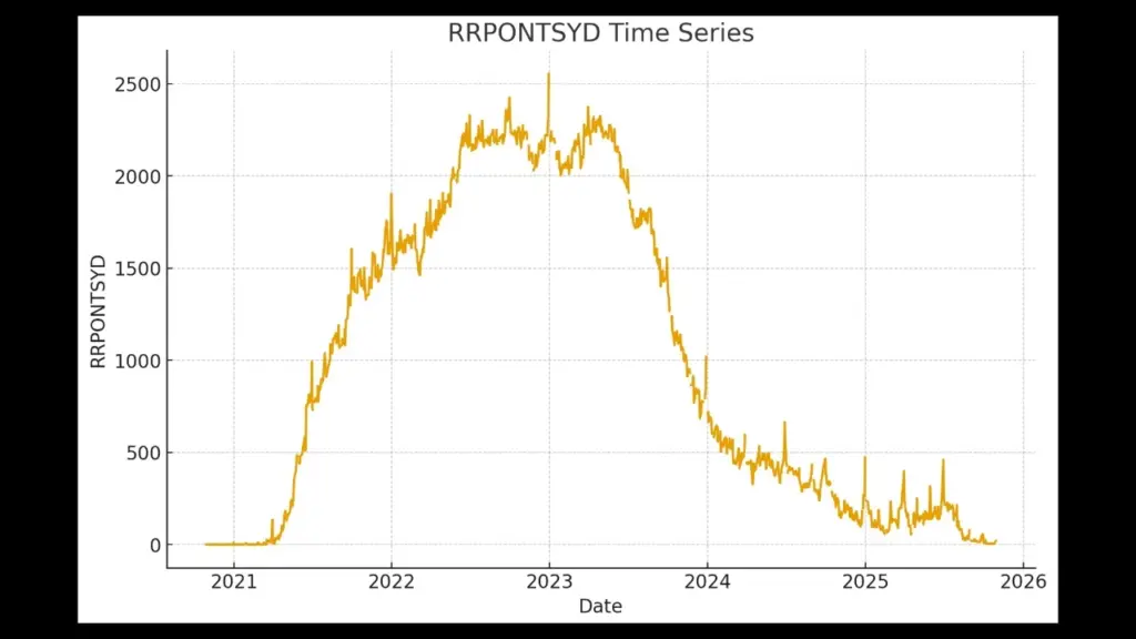 実際にRRP残高はパンデミック後に急増し、2022年に約2.6兆ドルでピークを付けた後、2023〜2025年にかけて大きく減少しました(FRED統計)。